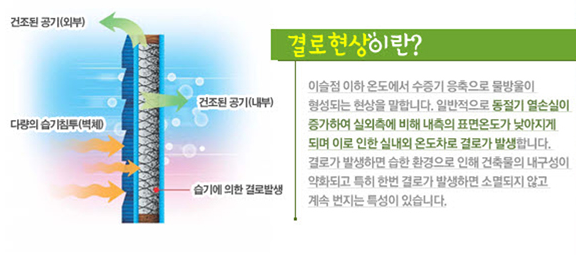 결로는 결국 따뜻한 실내에서 차가운 벽에 이슬처럼 맺히는 현상을 말하는 것으로