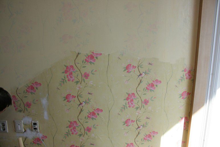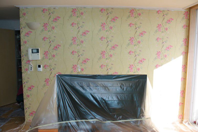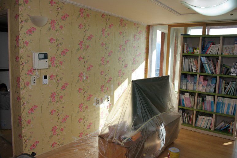 오늘은 꽃무늬가 화려한 벽지를 친환경 벽지페인트를 이용하여 간단하게