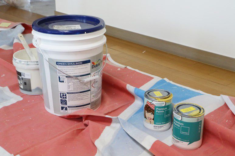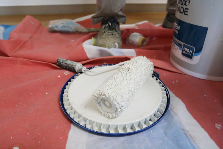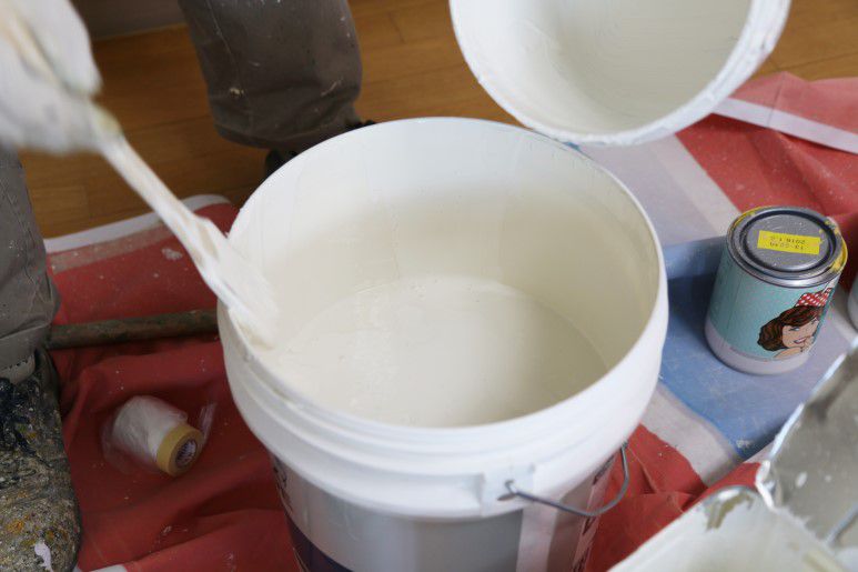 이렇게 많은 양의 페인트 작업을 할 때는 트레이 보다는 대형 사각 페인트 캔이 좋답니다.